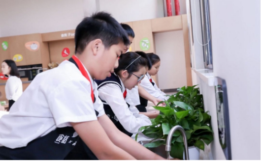 最后,每个学生都要清洗自己的餐具,值日的同学还要负责所有的牛奶盒都打开清洗一遍,晾晒后再集中回收。一切结束之后,孩子们还要自己动手,擦地清洁。学校在日复一日的午餐食育过程中,将学生培育成有序、有礼、有节的高素质人才,也教会了学生认识食物,与自然和谐相处的能力。