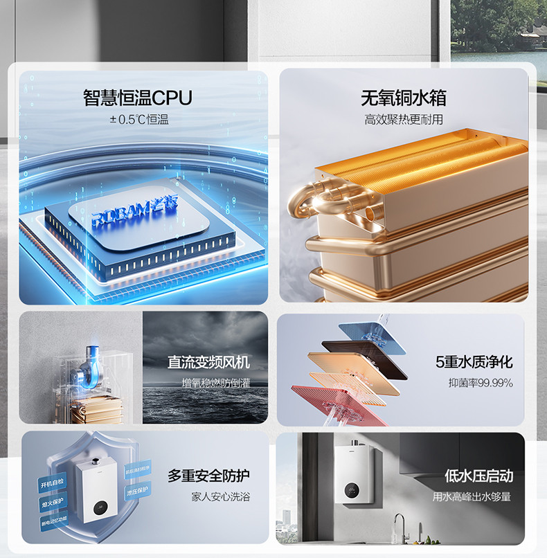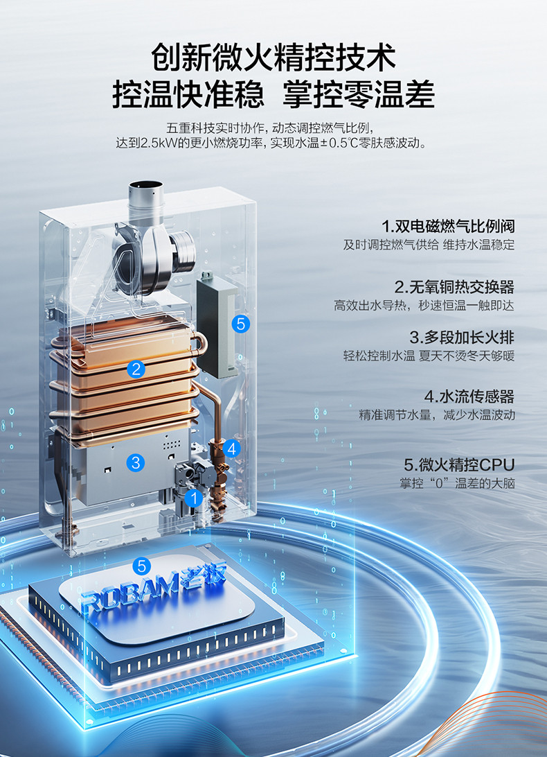微火精控技术、五重水质净化、低水压启动